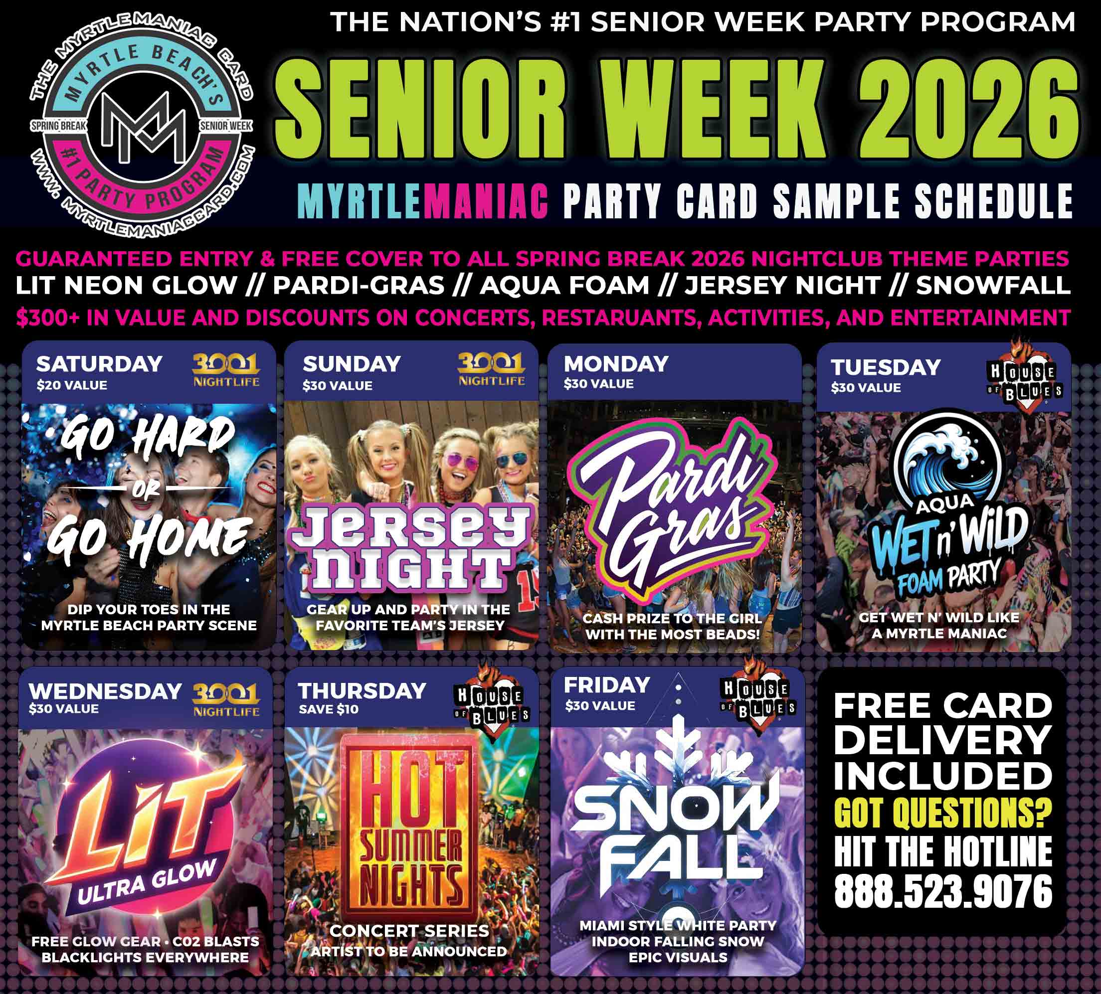 The MyrtleManiac Party Card is your golden ticket to the best that Myrtle Beach has to offer during your Senior Week celebration.